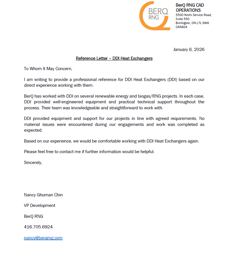 Subject: DDI Heat exchangers reference letter